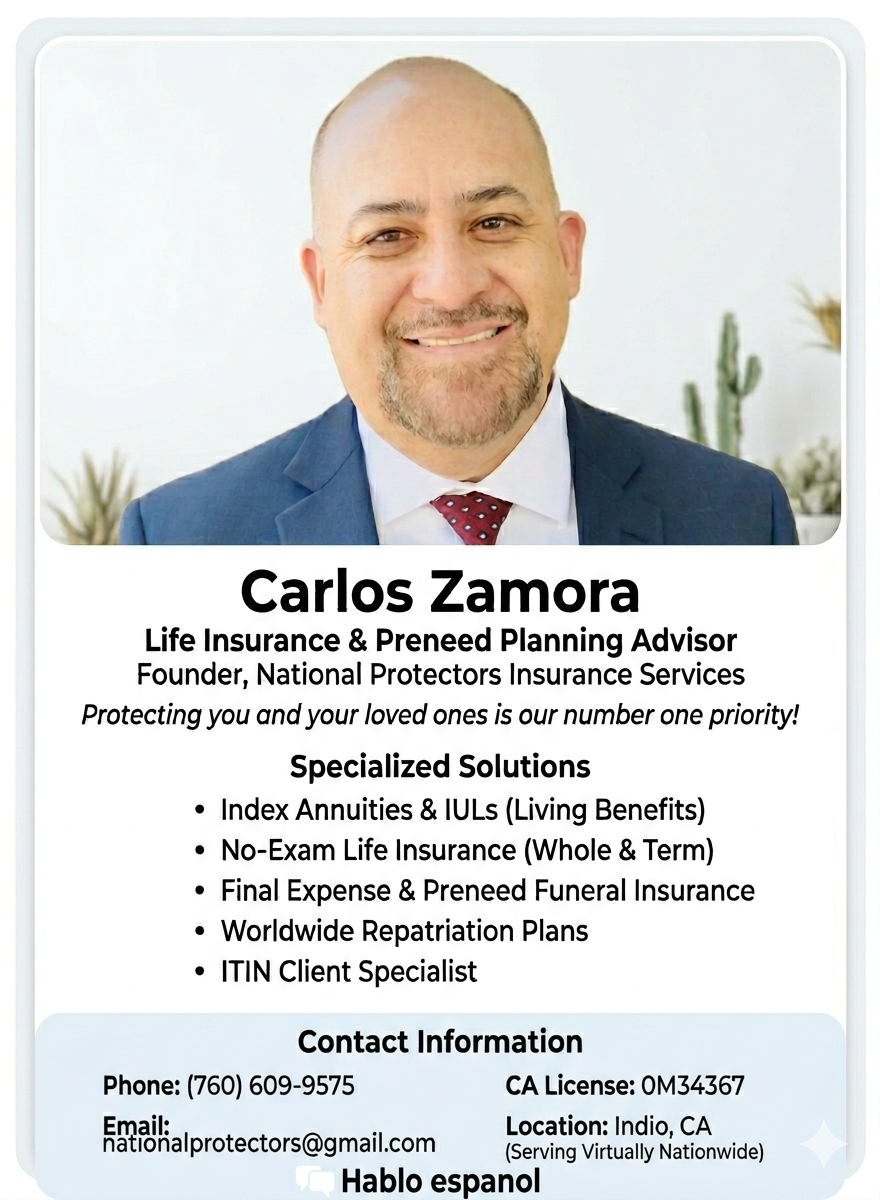 Whether you’re looking for tax‑advantaged IUL strategies, Life Insurance with Living Benefits, specialized solutions for ITIN clients, or Annuities designed to protect and grow your money, we offer multiple plans with no medical exams required. Our mission is to help you secure your legacy and ensure your loved ones are never left with a financial burden.